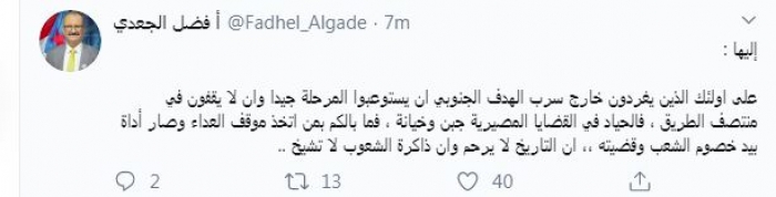 وكتب في تغريدة عبر "تويتر" رصدها "المشهد العربي": "على أولئك الذين يغردون خارج سرب الهدف الجنوبي أن يستوعبوا المرحلة جيدًا وأن لا يقفون في منتصف الطريق، فالحياد في القضايا المصيرية جبن وخيانة، فما بالكم بمن اتخذ موقف العداء وصار أداة بيد خصوم الشعب وقضيته، إن التاريخ لا يرحم وأن ذاكرة الشعوب لا تشيخ".