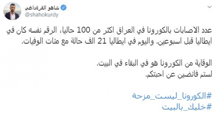 طالب الكاتب الصحفي العراقي شاهو القرةداغي، اليوم، العراقيين بالبقاء في منازلهم وذلك خوفًا من تفشي فيروس كورونا.