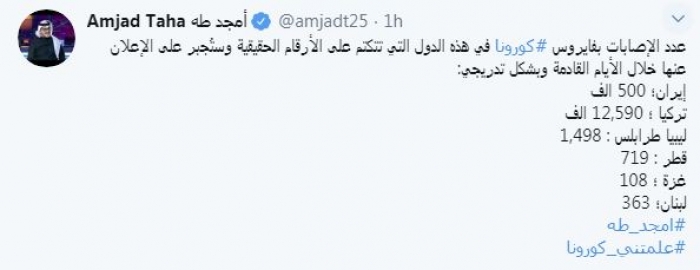 وقال في تغريدة عبر "تويتر" رصدها "المشهد العربي": "عدد الإصابات بفيروس كورونا في هذه الدول التي تتكتم على الأرقام الحقيقية وستُجبر على الإعلان عنها خلال الأيام القادمة وبشكل تدريجي: إيران 500 ألف، تركيا 12,590 ألف، ليبيا طرابلس: 1,498، قطر : 719، غزة 108، لبنان 363".