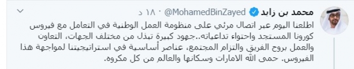 وقال بن زايد فى تغريدة له عبر حسابه بتويتر: "اطلعنا اليوم عبر اتصال مرئي على منظومة العمل الوطنية في التعامل مع فيروس كورونا المستجد واحتواء تداعياته"