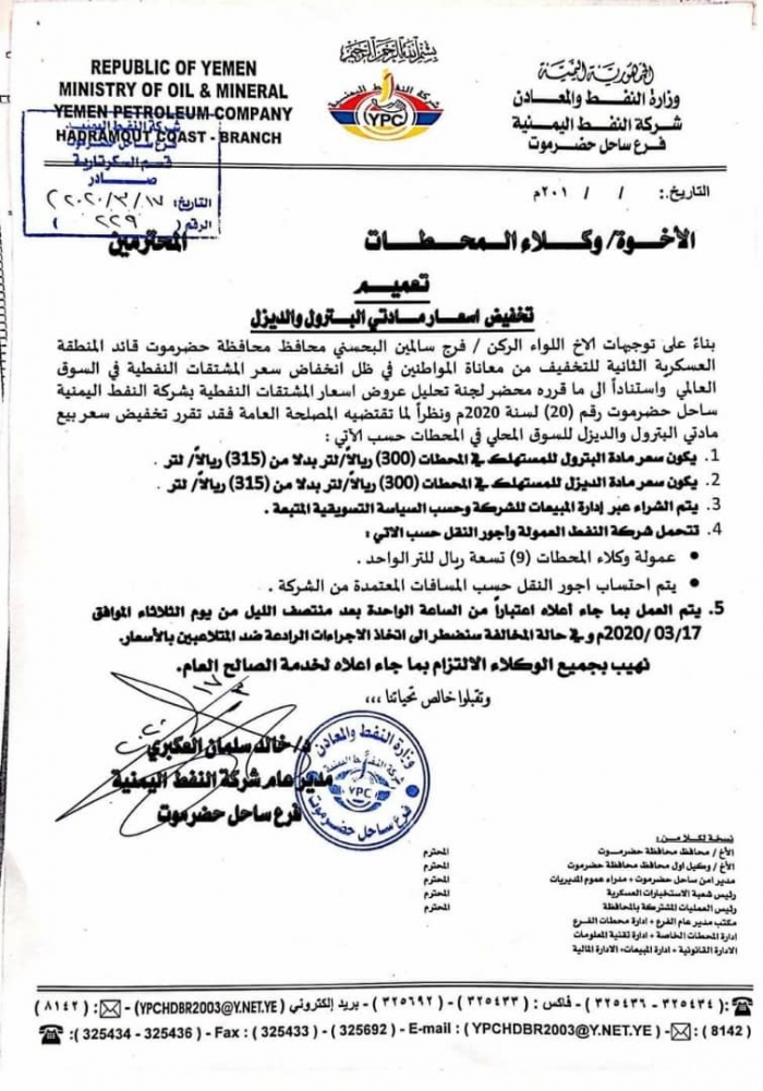 300 ريال للتر الديزل والبترول بساحل حضرموت (وثيقة)