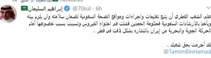 وقال في تغريدة عبر "تويتر" رصدها "المشهد العربي": "على الشعب القطري أن يتبع تعليمات وإجراءات ومواقع الصحة السعودية لضمان سلامته وأن يلزم بيته ويأخذ بالإرشادات السعودية".