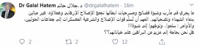 وأضاف: "المهم أن تُسلّم قوات الإصلاح والشرعية المعسكرات إلى جماعات الحوثيين، والأوامر: سلموا.. وتوجّهوا إلى شبوة! هل نحن بحاجة إلى مزيدٍ من البراهين على خياناتهم؟".