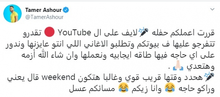 وكتب عاشور تغريدة، عبر حسابه الرسمي بموقع "تويتر": " قررت أعملكم حفلة لايف، تقدروا تتفرجوا عليها ف بيوتكم وتطلبوا الأغاني اللي إنتو عايزنها وندور على أي حاجة فيها طاقة إيجابية ونعملها وإن شاء الله أزمة وهتعدي".