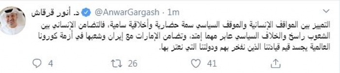 وكتب في تغريدة عبر "تويتر" رصدها "المشهد العربي": "التمييز بين المواقف الإنسانية والموقف السياسي سمة حضارية وأخلاقية سامية، فالتضامن الإنساني بين الشعوب راسخ والخلاف السياسي عابر مهما امتد، وتضامن الإمارات مع إيران وشعبها في أزمة كورونا العالمية يجسد قيم قيادتنا الذين نفخر بهم ودولتنا التي نعتز بها".