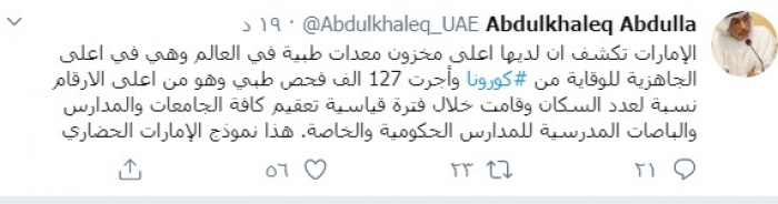 وكتب عبد الله عبر تغريدة له على "تويتر" رصدها "المشهد العربي":" الإمارات تكشف أن لديها أعلى مخزون معدات طبية في العالم وهي في أعلى الجاهزية للوقاية من كورونا".