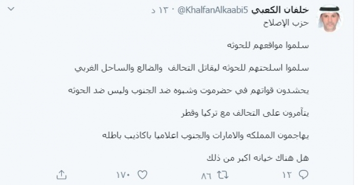 وكتب الكعبي عبر تغريدة له على "تويتر" رصدها "المشهد العربي":"حزب الإصلاح سلموا مواقعهم للحوثة، سلموا أسلحتهم للحوثي ليقاتل التحالف والضالع والساحل الغربي".
