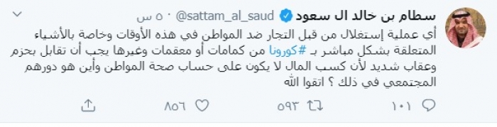 وكتب آل سعود عبر تغريدة له على "تويتر" رصدها "المشهد العربي":"أي عملية استغلال من قبل التجار ضد المواطن في هذه الأوقات وخاصة بالأشياء المتعلقة بشكل مباشر بـ كورونا من كمامات أو معقمات وغيرها يجب أن تقابل بحزم وعقاب شديد".