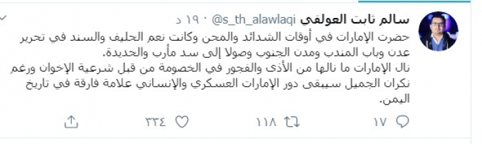 وكتب العولقي عبر تغريدة له على "تويتر" رصدها "المشهد العربي":"حضرت الإمارات في أوقات الشدائد والمحن وكانت نعم الحليف والسند في تحرير عدن وباب المندب ومدن الجنوب وصولا إلى سد مأرب والحديدة".