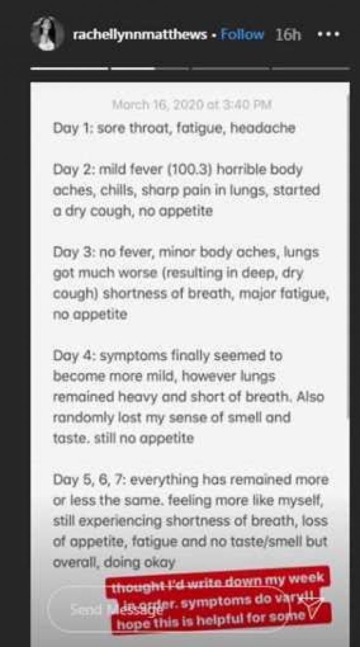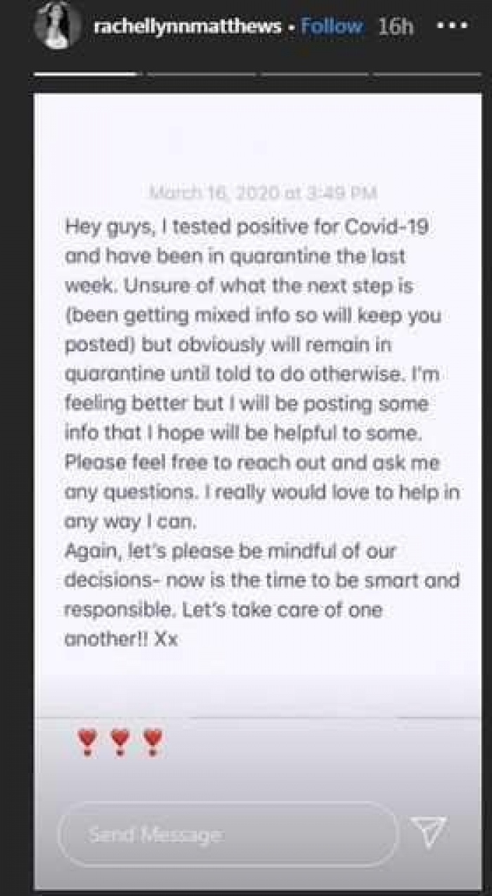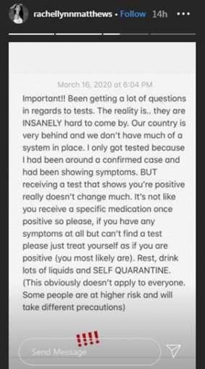 ونشرت راشيل ماثيوز، عبر خاصية "الاستوري"، على إنستجرام،: "مرحبا يا رفاق لقد أجريت اختبارًا وجاءت النتائج إيجابية لفيروس كورونا، وخضعت للحجر الصحي الأسبوع الماضي ولست متأكدة من الخطوة التالية، ولكن من الواضح حتى الآن بقائي في الحجر الصحي حتى يطلب مني عكس ذلك، أنا أشعر بتحسن ولكنني سأشارك ببعض المعلومات التي ستكون مفيدة للبعض.
