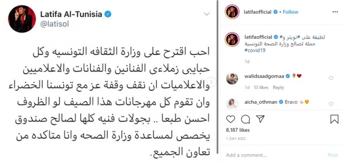 لطيفة توجه رسالة لوزارة الثقافة التونسية لمحاربة كورونا