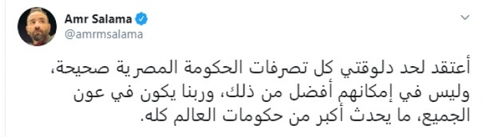 وكتب: "أعتقد لحد دلوقتي، كل تصرفات الحكومة المصرية صحيحة، وليس في إمكانهم أفضل من ذلك، وربنا يكون في عون الجميع، ما يحدث أكبر من حكومات العالم كله".