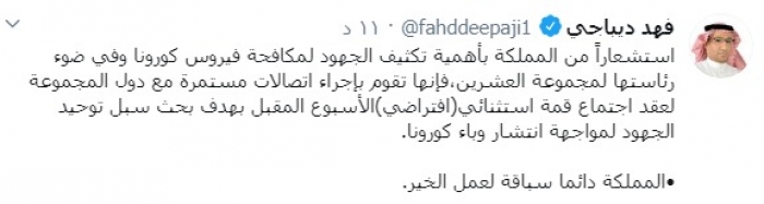 وكتب ديباجي عبر تغريدة له على "تويتر" رصدها "المشهد العربي":"استشعاراً من المملكة بأهمية تكثيف الجهود لمكافحة فيروس كورونا، وفي ضوء رئاستها لمجموعة العشرين،فإنها تقوم بإجراء اتصالات مستمرة مع دول المجموعة لعقد اجتماع قمة استثنائي(افتراضي)الأسبوع المقبل".