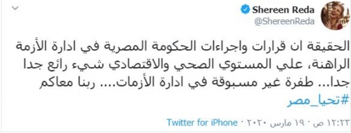 وكتبت "شيرين" عبر حسابها الرسمي بموقع تويتر: "الحقيقة إن قرارات وإجراءات الحكومة المصرية في إدارة الأزمات الراهنة، على المستوى الصحي والإقتصادي، شيء رائع جدًا، طفرة غير مسبوقة في إدارة الأزمات، ربنا معاكم وتحيا مصر".