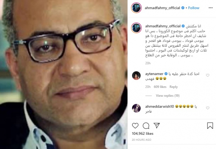 وكتب فهمي، في منشوره: "أنا ما كنتش حابب أتكلم في موضوع الـ"كورونا"، بس أنا شايف إن أخطر حاجة في الموضوع ده هو بيومي فؤاد، بيومي هو أقصر وأسهل طريق لنشر الفيروس؛ لأنه بيتنقل بين 3 أو 4 لوكيشنات في اليوم، اجتنبوا بيومي، الوقاية خير من العلاج".