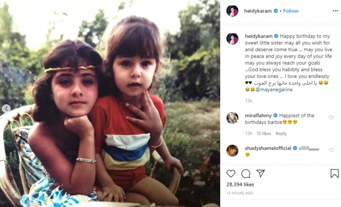 احتفلت الفنانة هيدي كرم، بعيد ميلاد شقيقتها "مايان"، ونشرت صور تجمعهما من مراحل عمرية مختلفة، وذلك عبر حسابها الرسمي بموقع إنستجرام.