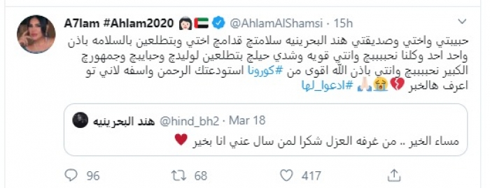 وكتبت أحلام، عبر حسابها على تويتر، قائلة:" حبيبتي وأختي وصديقتي هند البحرينية سلامتك اختي وبتطلعين بالسلامة بإذن واحد أحد وكلنا نحبك وانتي قوية وشدي حيلك بتطلعين لوليدك وحبايبك وجمهورك الكبير نحبك وانتي بإذن الله اقوى من كورونا استودعتك الرحمن واسفه لاني لسه عارفه الخبر ادعو لها ".