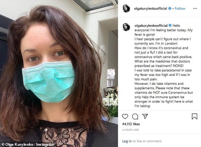 وظهرت أولجا كوريلينكو على صفحتها الشخصية بإنستجرام، وقالت إن درجة حرارتها تحسنت بنسبة كبيرة بعدما كانت ترفض التواجد المستشفى، ونشرت أولجا صورة لها وهى ترتدى قناعا طبيا باللون الأخضر إضافة إلى صور مجموعة من زجاجات الفيتامين، وكتبت على الصورة، "مرحبا بالجميع.. أشعر بتحسن اليوم.. لقد تخلصت من الحمى.. الناس تتساءل عن مكانى الآن.. أنا فى لندن.. وكيف عرفت أننى مصابة بفيروس كورونا وليس مجرد أنفلونزا؟ ببساطة لقد أجريت اختبار فيروس كورونا وجاءت نتيجته إيجابية".