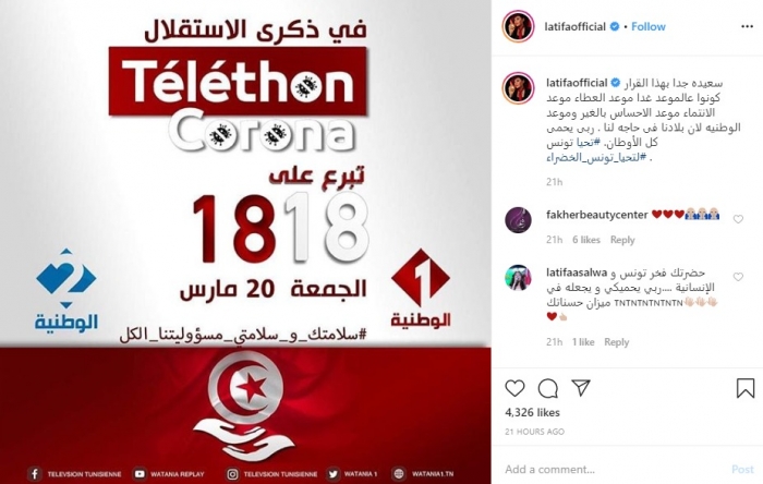 نشرت الفنانة التونسية لطيفة صورة عبر حسابها على إنستجرام، لحملة تبرعات في بلادها، بمناسبة ذكرى الاستقلال، لمواجهة فيروس كورونا.
