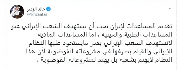 وكتب في تغريدة عبر "تويتر" رصدها "المشهد العربي": "تقديم المساعدات لإيران يجب أن يستهدف الشعب الإيراني عبر المساعدات الطبية والعينية، أما المساعدات المادية لا تستهدف الشعب الإيراني بقدر ما يستحوذ عليها النظام الإيراني والقيام بصرفها في مشروعاته الفوضوية لأن هذا النظام لا يهتم بشعبه بل يهتم لمشروعاته الفوضوية".