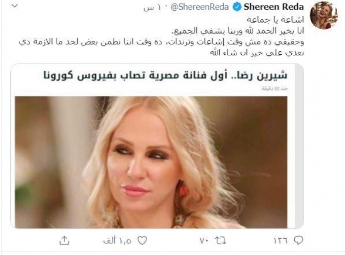 نشرت الفنانة المصرية شيرين رضا، عبر حسابها الشخصي بموقع "تويتر"، تغريدة تعلق بها على الأخبار المنتشرة بإصابتها بفيروس كورونا.