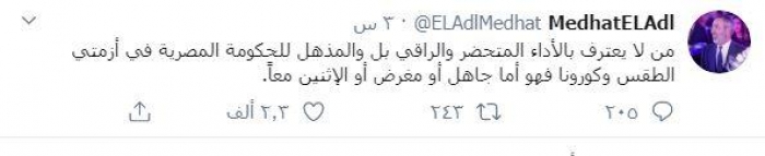نشر الكاتب والسيناريست المصري مدحت العدل، عبر حسابه الشخصي بموقع "تويتر"، تغريدة يعلق بها على تعامل الحكومة المصرية مع أزمتي الطقس وكورونا.
