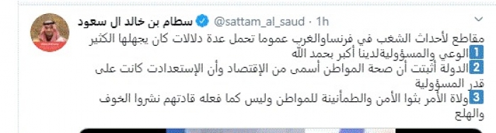 وكتب في تغريدة عبر "تويتر" رصدها "المشهد العربي": "مقاطع لأحداث الشغب في فرنساوالغرب عموما تحمل عدة دلالات كان يجهلها الكثير الوعي والمسؤولية لدينا أكبر بحمد الله".