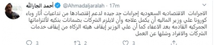 وقال في تغريدة عبر "تويتر" رصدها "المشهد العربي": "الإجراءات الاقتصادية السعوديه إجراءات جدا جيده لدعم اقتصادها من تداعيات أثار وباء كورونا علي وزير المالية أن يكمل علاجه وأن لا يلزم الشركات بضمانات بنكيه لالتزاماتها الجمركية القادمة بعد الإعفاء كما أن علي الوزير إيقاف هيئه الزكاة من إيقاف خدمات الشركات والافراد وشلها عن العمل".