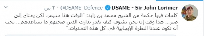 وكتب لوريمر عبر تغريدة له على "تويتر" رصدها "المشهد العربي":"كلمات فيها حكمة من الشيخ محمد بن زايد: "الوقت هذا سيمر، لكن يحتاج إلى صبر... هذا وقت إن نحن نشوف كيف نقدر نداري الذين صحتهم ما تساعدهم... يجب أن تكون عندنا النظرة الإيجابية في كل هذه التحديات."
