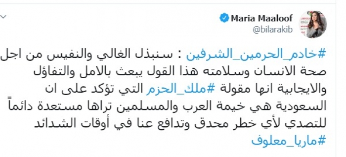 وكتبت معلوف عبر تغريدة لها على "تويتر" رصدها "المشهد العربي":" خادم الحرمين الشرفين : سنبذل الغالي والنفيس من اجل صحة الإنسان وسلامته هذا القول يبعث بالأمل والتفاؤل والايجابية".