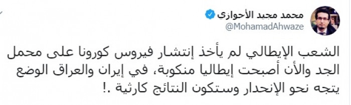 وكتب الأحوازي عبر تغريدة له على "تويتر" رصدها "المشهد العربي":"الشعب الإيطالي لم يأخذ انتشار فيروس كورونا على محمل الجد والآن أصبحت إيطاليا منكوبة".