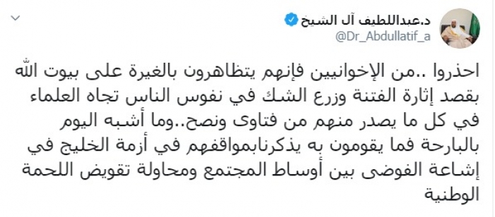 وكتب آل الشيخ عبر تغريدة له على "تويتر" رصدها "المشهد العربي" :"احذروا ..من الإخوانيين فإنهم يتظاهرون بالغيرة على بيوت الله بقصد إثارة الفتنة وزرع الشك في نفوس الناس تجاه العلماء في كل ما يصدر منهم من فتاوى ونصح".