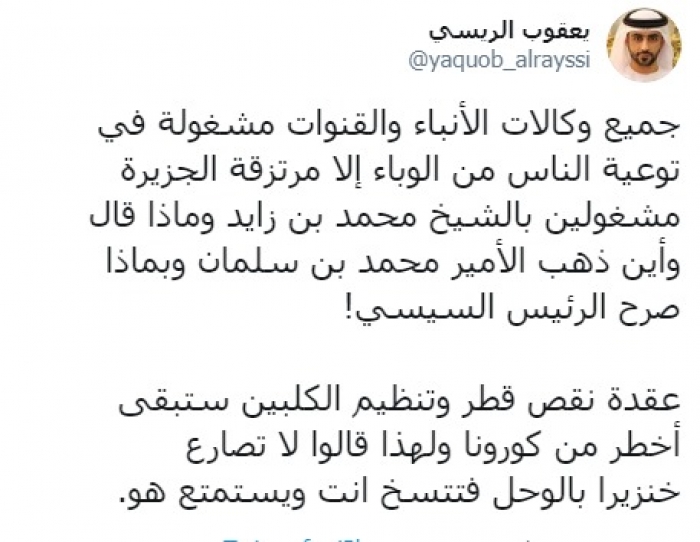 وكتب الريسي عبر تغريدة له على "تويتر" رصدها "المشهد العربي":"جميع وكالات الأنباء والقنوات مشغولة في توعية الناس من الوباء إلا مرتزقة الجزيرة".