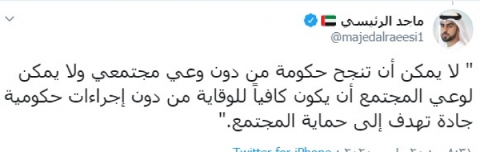 قال الكاتب الإماراتي ماجد الرئيسي، اليوم ، إن هناك بعض الدول تحقد على دولة الإمارات العربية المتحدة بسبب إجراءاتها المتخذة ضد انتشار فيروس كورونا.