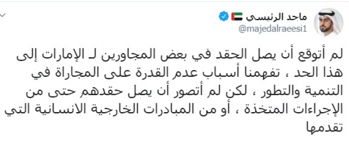 وكتب الرئيسي عبر تغريدة له على "تويتر" رصدها "المشهد العربي":" لم أتوقع أن يصل الحقد في بعض المجاورين لـ الإمارات إلى هذا الحد ، تفهمنا أسباب عدم القدرة على المجاراة في التنمية والتطور ، لكن لم أتصور أن يصل حقدهم حتى من الإجراءات المتخذة ، أو من المبادرات الخارجية الإنسانية التي تقدمها".