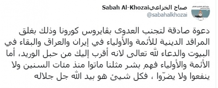 وكتب الخزاعي عبر تغريدة له على "تويتر" رصدها "المشهد العربي":"دعوة صادقة لتجنب العدوى بڤايروس كورونا وذلك بغلق المراقد الدينية للأئمة والأولياء في إيران والعراق والبقاء في البيوت والدعاء لله تعالى لأنه أقرب إليك من حبل الوريد".