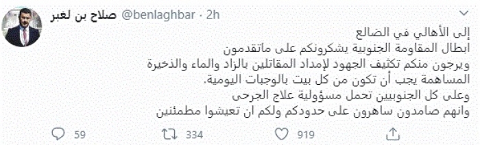 وقال في تغريدة عبر "تويتر" رصدها "المشهد العربي": "إلى الأهالي في الضالع أبطال المقاومة الجنوبية يشكرونكم على ما تقدمون ويرجون منكم تكثيف الجهود لإمداد المقاتلين بالزاد والماء والذخيرة".