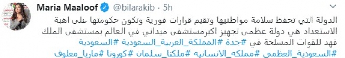 وقالت في تغريدة عبر "تويتر" رصدها "المشهد العربي": "الدولة التي تحفظ سلامة مواطنيها وتقيم قرارات فورية وتكون حكومتها على آهبة الاستعداد هي دولة عظمى تجهيز أكبر مستشفى ميداني في العالم بمستشفى الملك فهد للقوات المسلحة في جدة".
