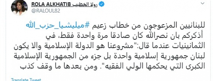 وقالت في تغريدة عبر "تويتر" رصدها "المشهد العربي": "للبنانيين المزعوجون من خطاب زعيم ميليشيا حزب الله أذكركم بان نصرالله كان صادقا مرة واحدة فقط، في الثمانينيات عندما قال: مشروعنا هو الدولة الإسلامية والا يكون لبنان جمهورية إسلامية واحدة بل جزء من الجمهورية الإسلامية الكبرى التي يحكمها الولي الفقيه ومن بعدها ما وقف كذب".