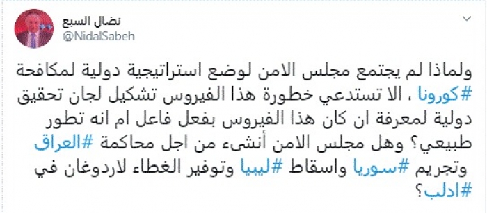 طالب المحلل السياسي اللبناني نضال السبع، اليوم، مجلس الأمن الدولي لوضع استراتيجية لمكافحة فيروس كورونا.