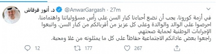 وقال في تغريدة عبر "تويتر" رصدها "المشهد العربي": "في أزمة كورونا، يجب أن نضع أحباءنا كبار السن على رأس مسؤولياتنا واهتمامنا".