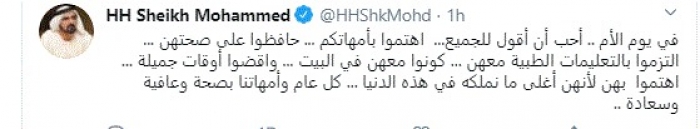 وقال في تغريدة عبر "تويتر" رصدها "المشهد العربي": "في يوم الأم.. أحب أن أقول للجميع.. اهتموا بأمهاتكم.. حافظوا على صحتهن.. التزموا بالتعليمات الطبية معهن".