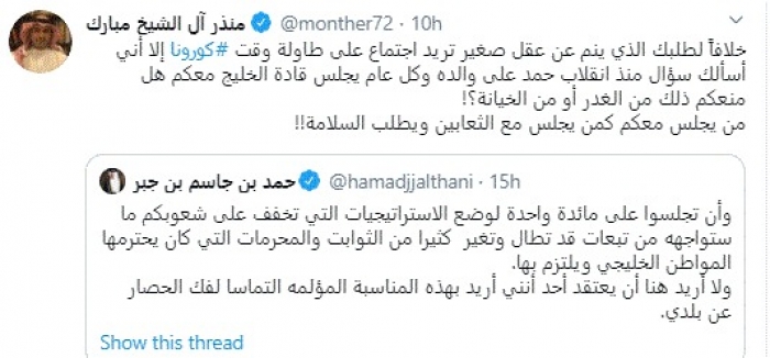 وقال في تغريدة عبر "تويتر" رصدها "المشهد العربي": "خلافاً لطلبك الذي ينم عن عقل صغير تريد اجتماع على طاولة وقت كورونا إلا أني أسألك سؤال منذ انقلاب حمد على والده وكل عام يجلس قادة الخليج معكم هل منعكم ذلك من الغدر أو من الخيانة؟! من يجلس معكم كمن يجلس مع الثعابين ويطلب السلامة".