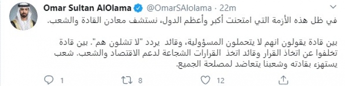 وقال في تغريدة عبر "تويتر" رصدها "المشهد العربي": "في ظل هذه الأزمة التي امتحنت أكبر وأعظم الدول، نستشف معادن القادة والشعب. بين قادة يقولون أنهم لا يتحملون المسؤولية، وقائد يردد لا تشلون هم. بين قادة تخلفوا عن اتخاذ القرار وقائد اتخذ القرارات الشجاعة لدعم الاقتصاد والشعب. شعب يستهزء بقادته وشعبنا يتعاضد لمصلحة الجميع".