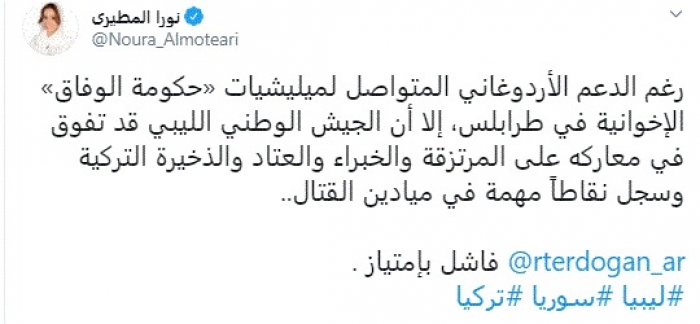 وكتبت في تغريدة عبر "تويتر" رصدها "المشهد العربي": "رغم الدعم الأردوغاني المتواصل لمليشيات حكومة الوفاق الإخوانية في طرابلس، إلا أن الجيش الوطني الليبي قد تفوق في معاركه على المرتزقة والخبراء والعتاد والذخيرة التركية وسجل نقاطاً مهمة في ميادين القتال.. أردوغان فاشل بامتياز".