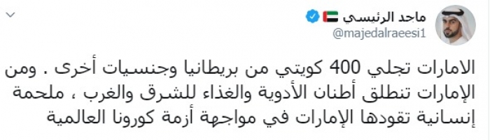 وكتب الرئيسي عبر تغريدة له على "تويتر" رصدها "المشهد العربي":" الإمارات تجلي 400 كويتي من بريطانيا وجنسيات أخرى، ومن الإمارات تنطلق أطنان الأدوية والغذاء للشرق والغرب".