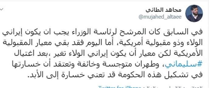 وكتب الطائي عبر تغريدة له على "تويتر" رصدها "المشهد العربي":"في السابق كان المرشح لرئاسة الوزراء يجب أن يكون إيراني الولاء وذو مقبولية أمريكية".