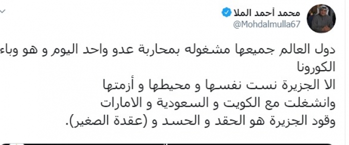 وكتب الملا عبر تغريدة له على "تويتر" رصدها " المشهد العربي":"دول العالم جميعها مشغولة بمحاربة عدو واحد اليوم و هو وباء الكورونا، إلا الجزيرة نست نفسها و محيطها و أزمتها وانشغلت مع الكويت و السعودية و الإمارات".