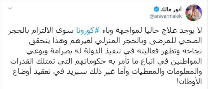 وكتب مالك عبر تغريدة له على "تويتر" رصدها " المشهد العربي":"لا يوجد علاج حاليا لمواجهة وباء كورونا سوى الالتزام بالحجر الصحي للمرضى وبالحجر المنزلي لغيرهم".