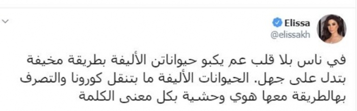 وكتبت إليسا تغريدة، عبر حسابها الرسمي بموقع "تويتر" :"في ناس بلا قلب عم يلقوا حيواناتهم الأليفة بطريقة مخيفة بتدل على الجهل، الحيوانات الأليفة ما بتنقل كورونا، والتصرف بهذه الطريقة معها وحشية بكل معنى الكلمة".